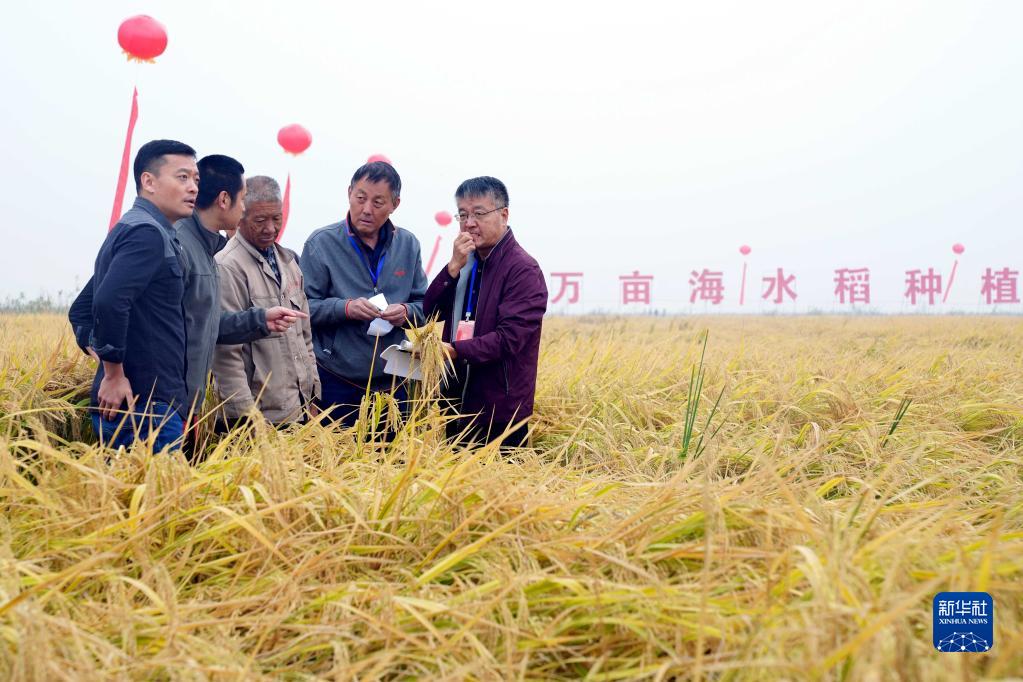 在山東濰坊市寒亭區海水稻三產(chǎn)融合示范基地,專(zhuān)家組成員在進(jìn)行測產(chǎn)(2020年10月16日攝)?!⌒氯A社記者 郭緒雷 攝