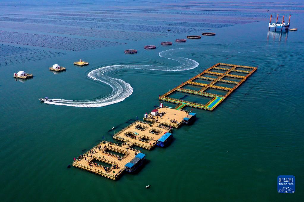 在山東榮成愛(ài)倫灣國家級海洋牧場(chǎng),游客乘坐游船前往海上觀(guān)光平臺游玩(2021年4月11日攝,無(wú)人機照片)?!⌒氯A社發(fā)(李信君 攝)