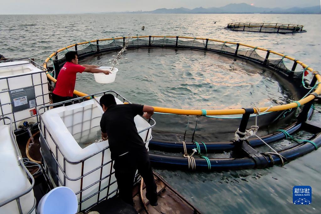 在山東日照市一個(gè)海洋牧場(chǎng),工作人員往養殖網(wǎng)箱投放魚(yú)苗(2020年9月9日攝)?!⌒氯A社發(fā)(房紅金 攝)