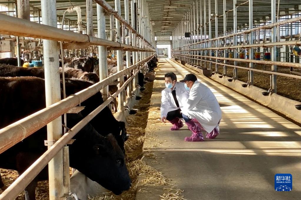 在黑龍江省龍江縣的和?,F代化繁殖基地,工作人員查看和牛生長(cháng)狀況(2020年12月3日攝)?!⌒氯A社記者 劉赫垚 攝