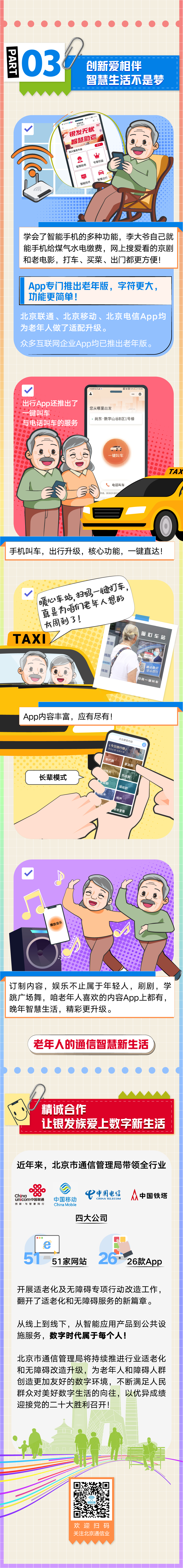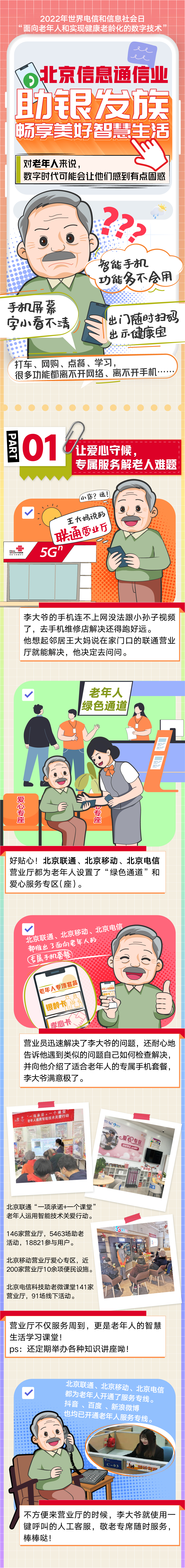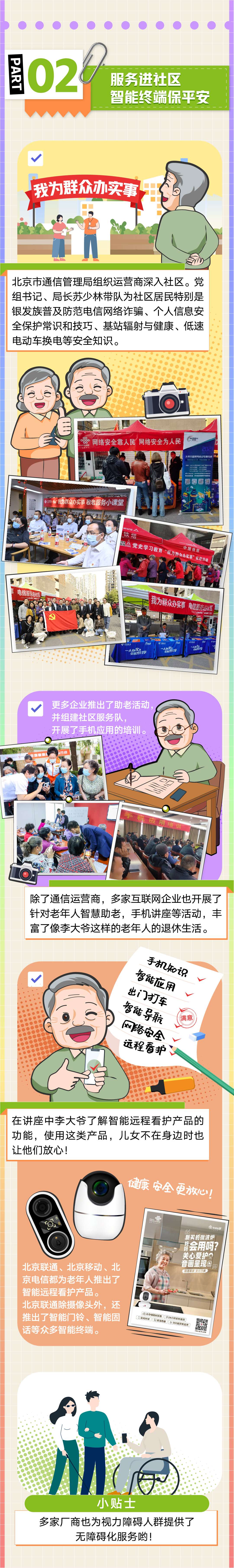 不僅如此,越來(lái)越多針對老年人的暖心智能服務(wù)出現在我們身邊。今年1月,北京移動(dòng)推出了10086視頻客服功能,可以通過(guò)視頻的方式為老年人‘面對面’‘手把手’提供服務(wù);北京聯(lián)通推出銀齡卡、孝心卡讓老年人與數字生活接軌,遠在異鄉的兒女,通過(guò)“異地同享”“聯(lián)通看家”等可以隨時(shí)關(guān)注老人;北京電信為老年人開(kāi)設助老“微課堂”,教老年人學(xué)會(huì )使用智能手機應用,同時(shí)聯(lián)手國家統計局老年大學(xué)進(jìn)行反詐知識科普,讓老年人守護好自身“錢(qián)袋子”……