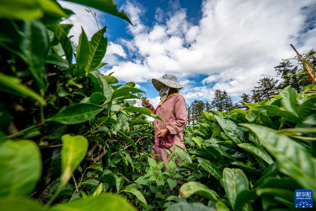 農戶(hù)在普洱市思茅區南屏鎮整碗村的有機茶葉基地采茶(5月13日攝)。新華社記者江文耀攝