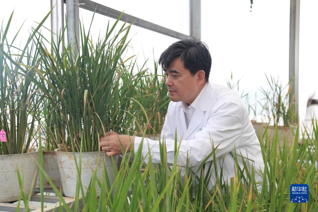 中國工程院院士、湖南省農業(yè)科學(xué)院黨委書(shū)記柏連陽(yáng)在實(shí)驗室查看水稻生長(cháng)情況(資料照片)。新華社發(fā)(受訪(fǎng)者供圖)