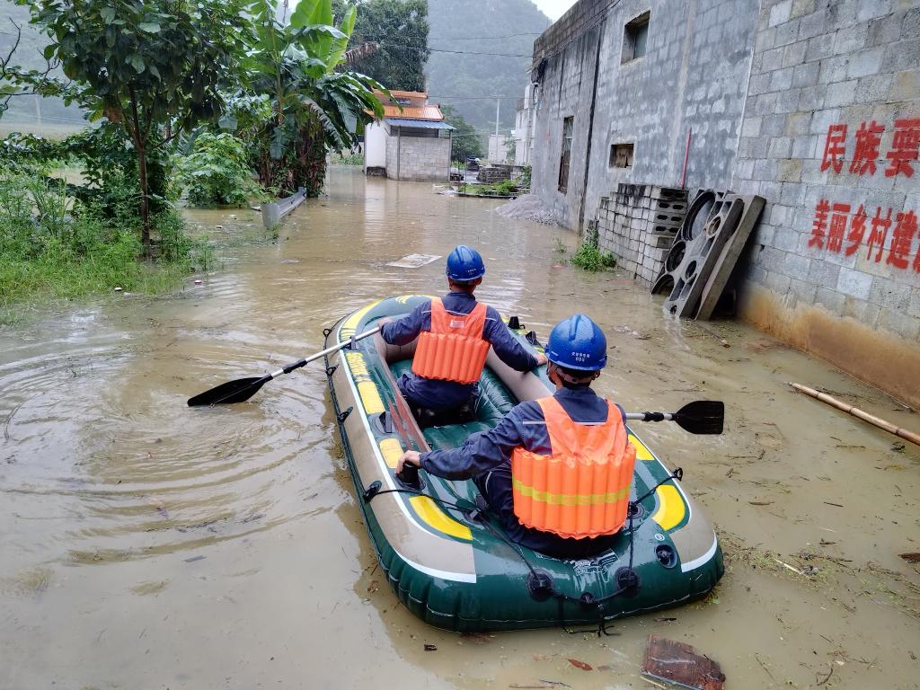 6月11日,南方電網(wǎng)天等供電局搶修人員乘坐皮劃艇前往天等縣天等鎮宏魁村三州屯檢查供電設備受災情況,為恢復供電做準備。(新華社發(fā))