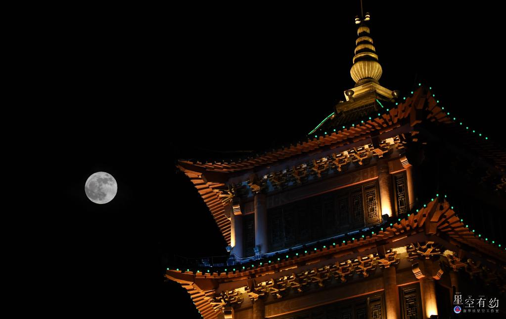 這是2022年6月14日晚在陜西省平利縣五峰樓拍攝的“超級月亮”。新華社記者 李一博 攝