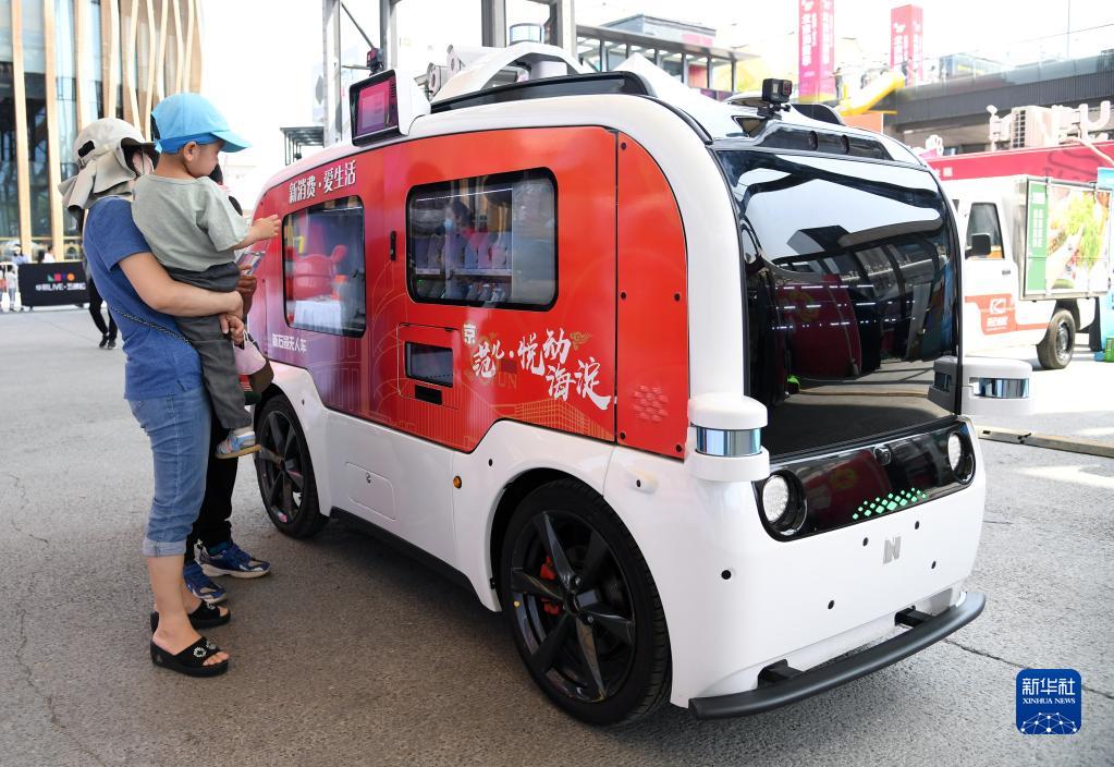 在“北京消費季·悅動(dòng)海淀”活動(dòng)現場(chǎng),市民通過(guò)城市綜合服務(wù)無(wú)人車(chē)購買(mǎi)飲品(2020年6月6日攝)。新華社記者 任超 攝