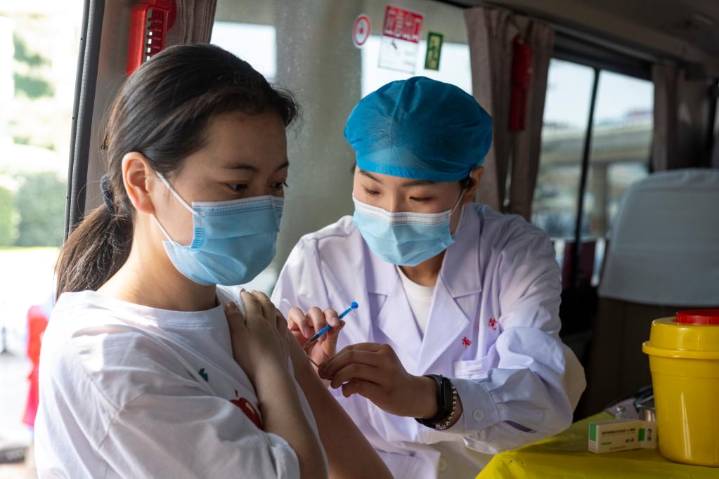 5月20日,在鄭州市金水區花園路與金水路交叉口,市民在新冠疫苗接種車(chē)上接種疫苗。新華社記者 徐嘉懿 攝