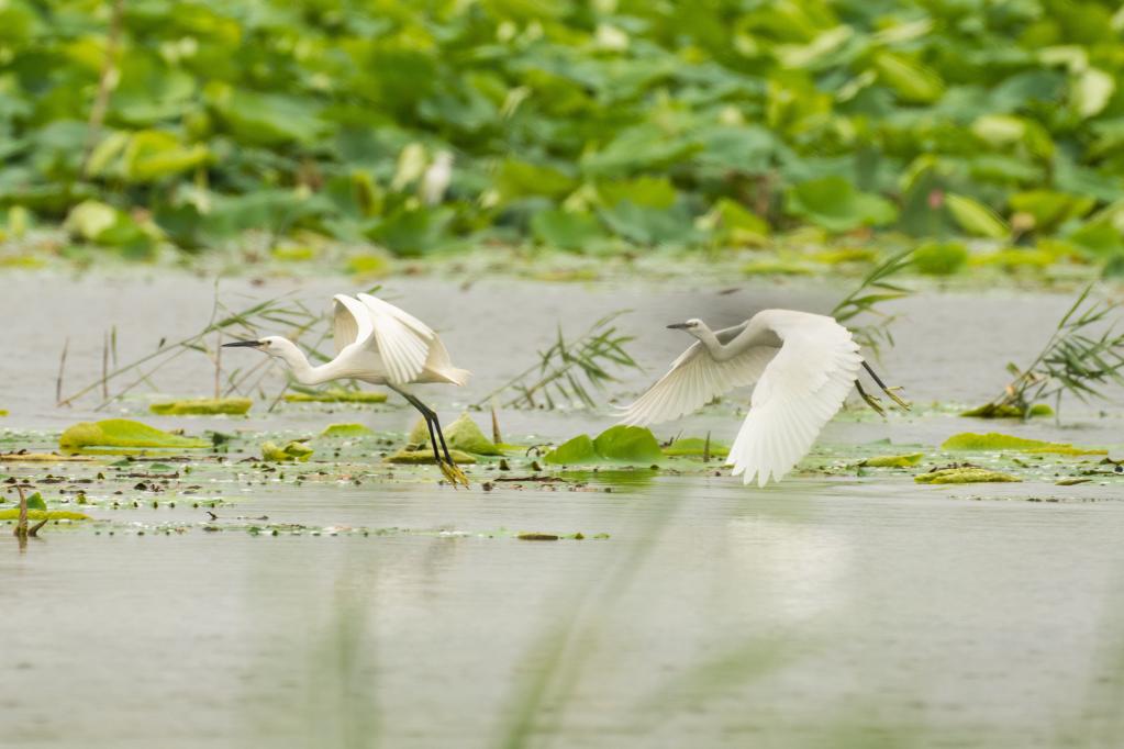 野生鳥(niǎo)類(lèi)在白洋淀飛舞嬉戲。(李鑫 攝)