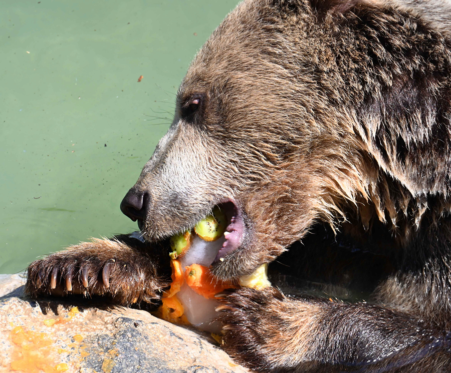 7月19日,在意大利羅馬動(dòng)物園,一只棕熊吃水果冰棍消暑。