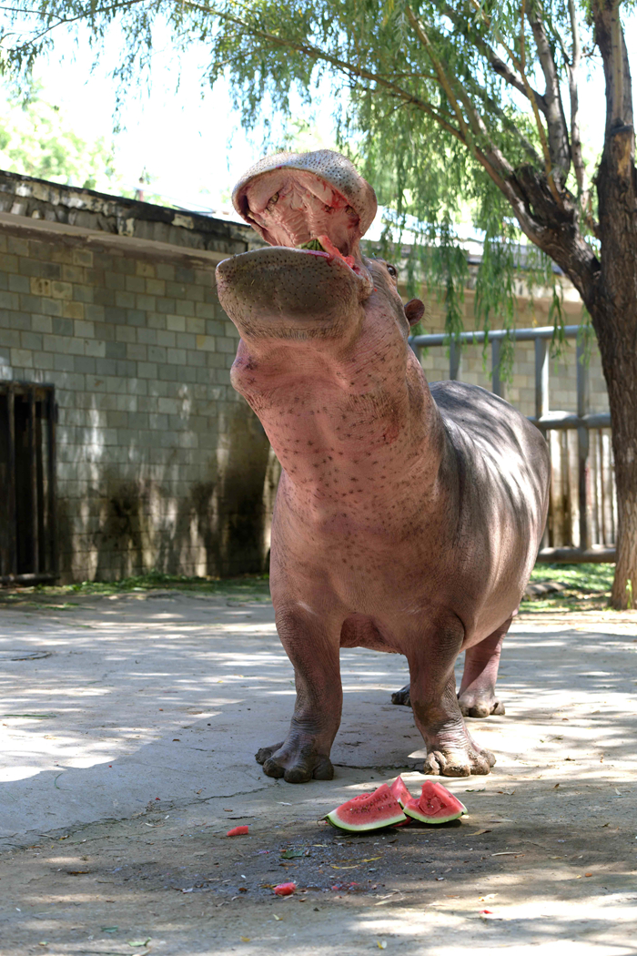 7月24日,石家莊市動(dòng)物園的河馬在吃西瓜。