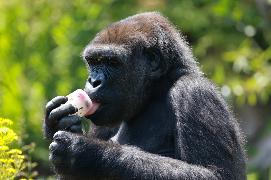 7月18日,在比利時(shí)布呂熱萊特市天堂動(dòng)物園,一只大猩猩享用“冰淇淋”。
