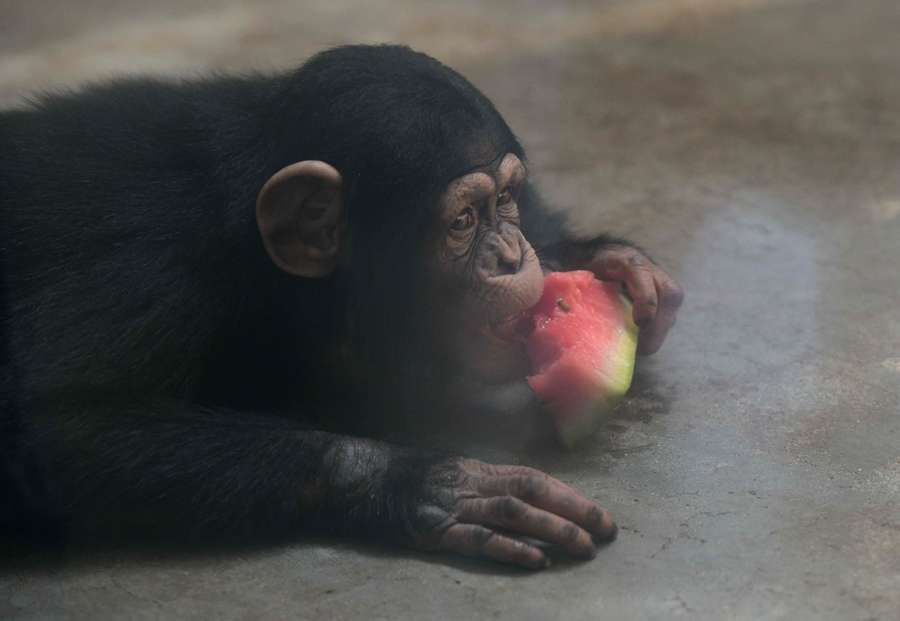 7月24日,石家莊市動(dòng)物園的猩猩在吃西瓜。