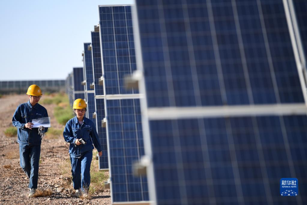 2022年6月13日,光伏電站工作人員李靜(右)和同事在甘肅省金昌市華能集團西坡光伏電站現場(chǎng)巡檢。新華社記者 陳斌 攝