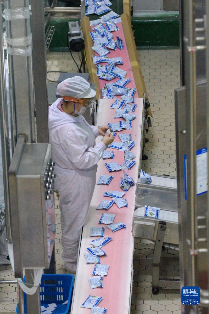 新疆天潤乳業(yè)股份有限公司的工作人員在生產(chǎn)線(xiàn)上忙碌(2020年3月1日攝)。新華社記者 丁磊 攝