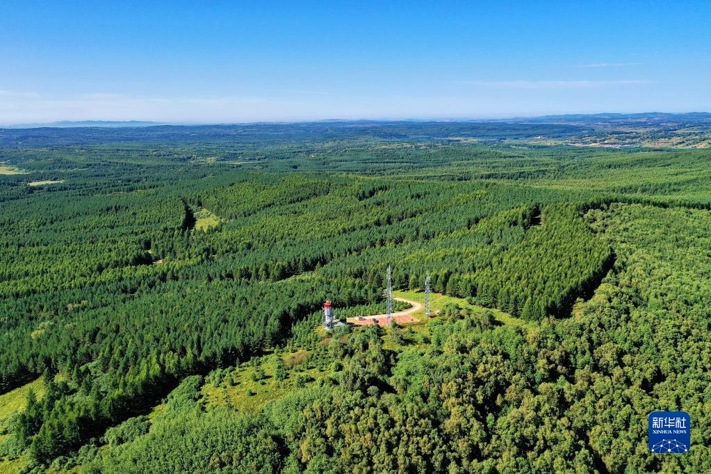 這是2021年8月23日拍攝的河北塞罕壩機械林場(chǎng)內的望海樓(無(wú)人機照片)。三代塞罕壩林場(chǎng)人50多年堅持植樹(shù)造林,用汗水澆灌出綠波涌動(dòng)的百萬(wàn)畝人工林海。新華社記者 牟宇 攝
