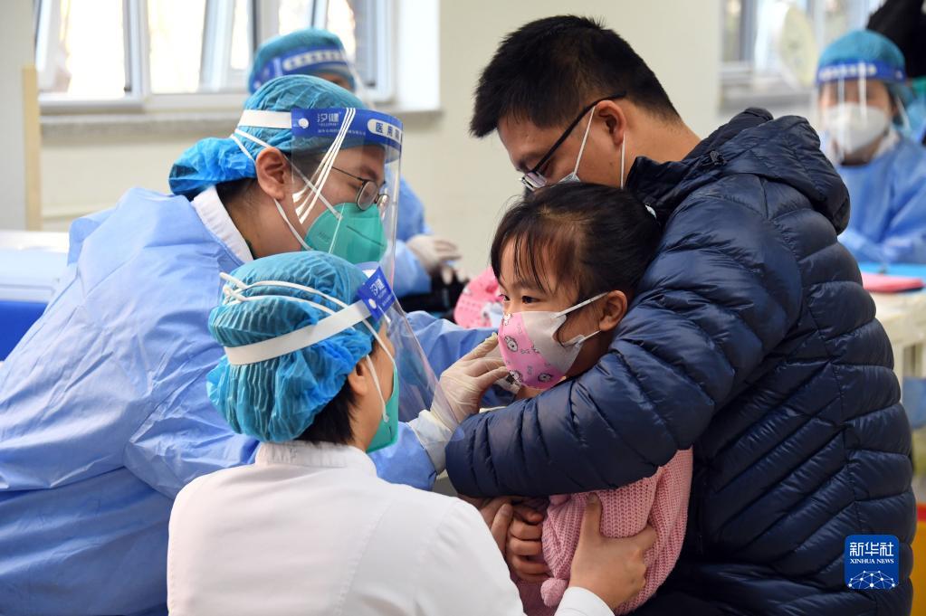 在北京市海淀區學(xué)院路街道新冠疫苗接種點(diǎn),醫護人員為一名小朋友接種新冠疫苗(2021年11月13日攝)。新華社記者 任超 攝