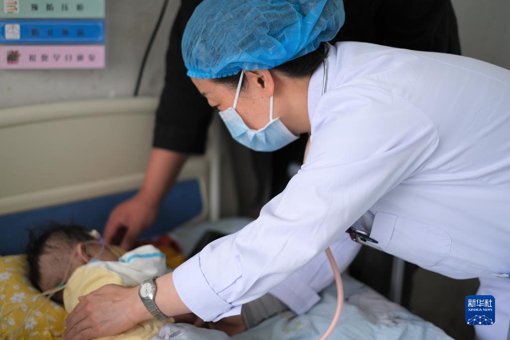 青海省婦女兒童醫院醫生、青南支醫隊員孫敬在青海省玉樹(shù)藏族自治州人民醫院給患者檢查身體(2022年4月25日攝)。新華社記者 韓方方 攝