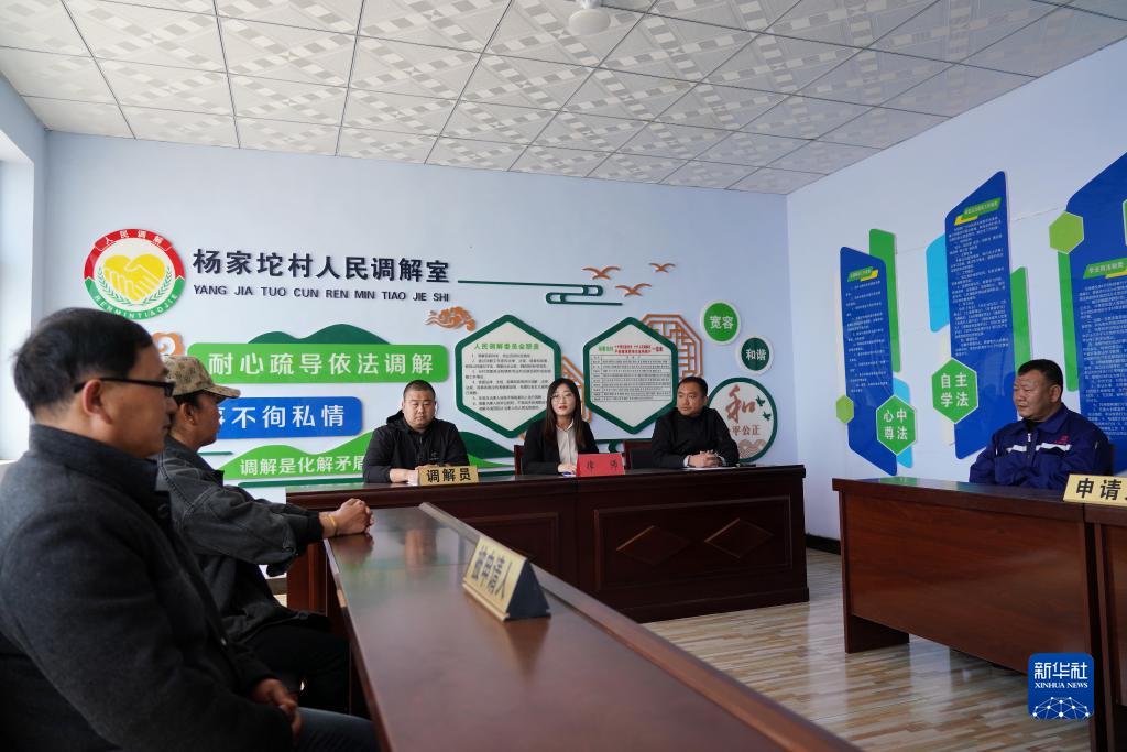 律師甄彩麗(中)在河北唐山灤州市茨榆坨鎮楊家坨村人民調解室內為群眾解答法律問(wèn)題(2021年4月18日攝)。新華社記者 牟宇 攝