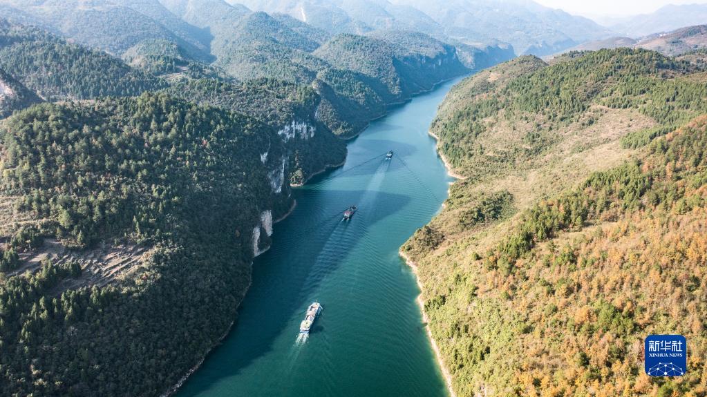 運載磷礦石的貨船沿烏江航道順流航行(2021年11月18日攝,無(wú)人機照片)。 新華社記者 陶亮 攝