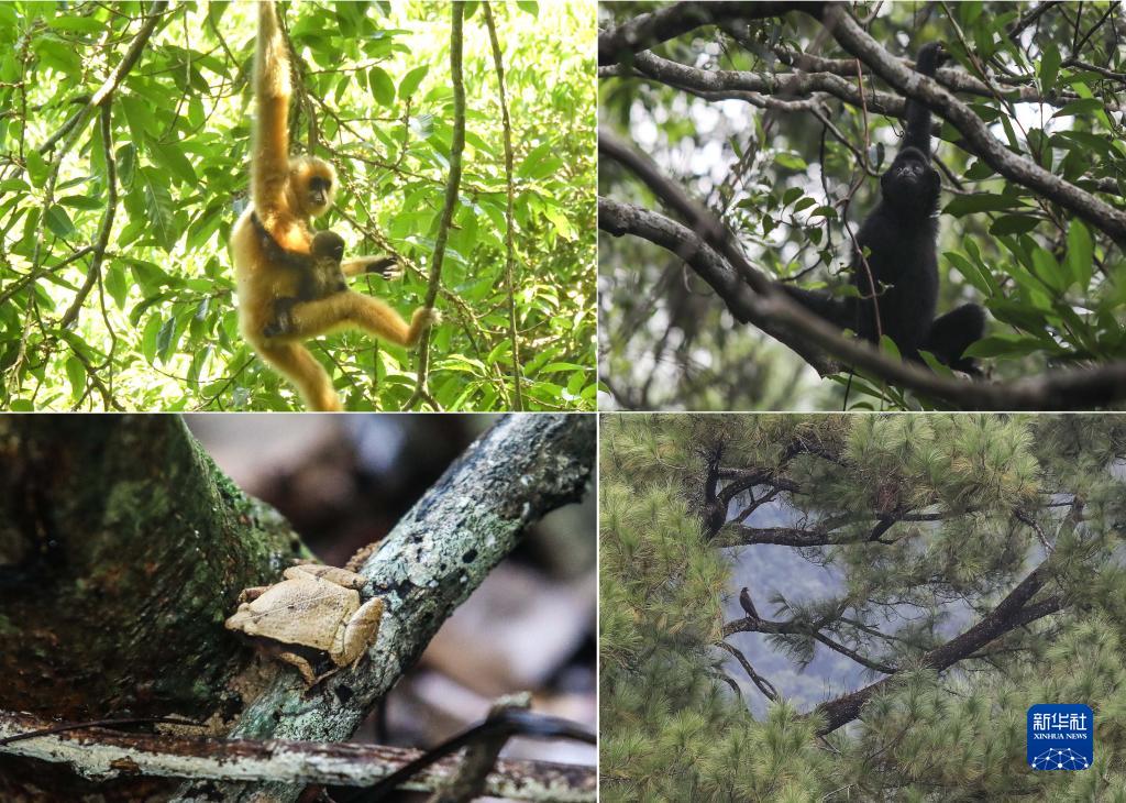 拼版照片:左上圖為2021年5月拍攝的海南長(cháng)臂猿B群幼猿(海南熱帶雨林國家公園管理局供圖);右上圖為在海南熱帶雨林國家公園體制試點(diǎn)區霸王嶺自然保護區內拍攝的海南長(cháng)臂猿(2019年10月25日新華社記者蒲曉旭攝);左下圖為在霸王嶺自然保護區內拍攝的姬蛙(2019年10月26日新華社記者蒲曉旭攝);右下圖為在霸王嶺自然保護區內拍攝的蛇雕(2019年10月26日新華社記者蒲曉旭攝)。 新華社發(fā)