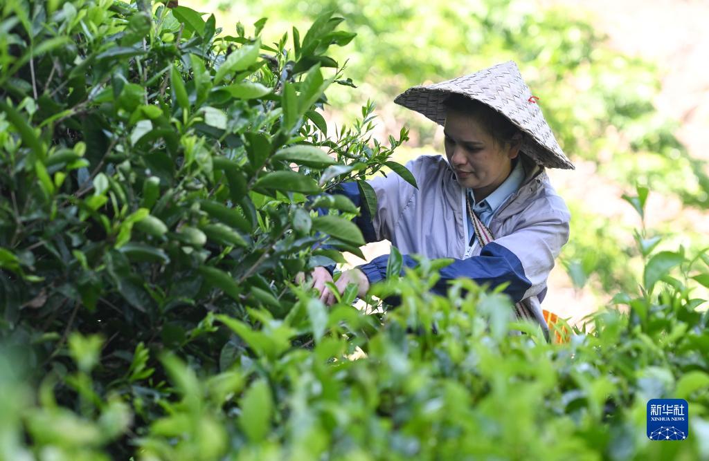 海南省五指山市水滿(mǎn)鄉毛納村茶農在茶園采茶(2022年4月10日攝)。 新華社記者 楊冠宇 攝