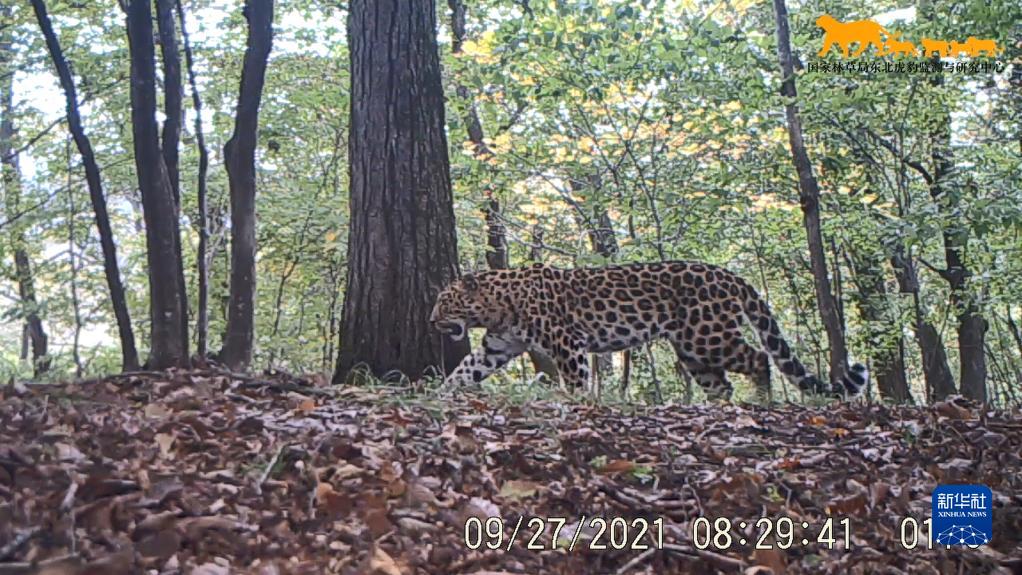 這是2021年9月27日利用“天地空一體化監測系統”在東北虎豹國家公園內監測到的野生東北豹影像(視頻截圖)。 新華社發(fā)