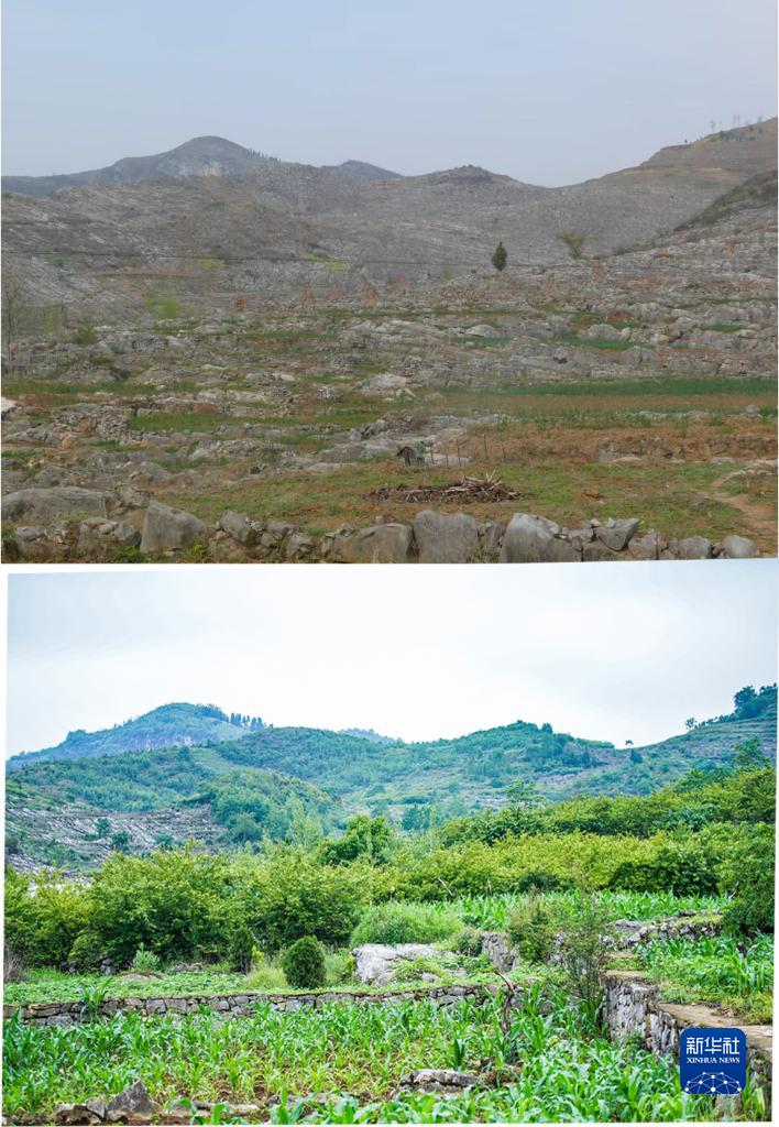拼版照片:上圖為貴州省畢節市大方縣羊場(chǎng)鎮桶井村石漠化治理點(diǎn)舊貌(資料照片,大方縣林業(yè)局供圖);下圖為2022年6月2日拍攝的畢節市大方縣羊場(chǎng)鎮桶井村石漠化治理點(diǎn)(新華社記者陶亮攝)。新華社發(fā)