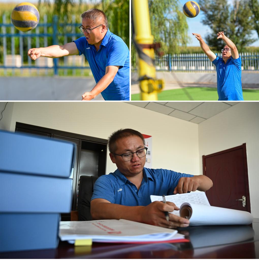 昂素鎮巴彥希里嘎查網(wǎng)格員阿木古浪在嘎查的排球場(chǎng)上打球、在嘎查辦公室辦公