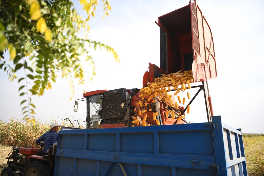 9月22日,玉米收割機將收獲的玉米倒入小四輪拖拉機車(chē)斗內。新華社記者張浩然 攝