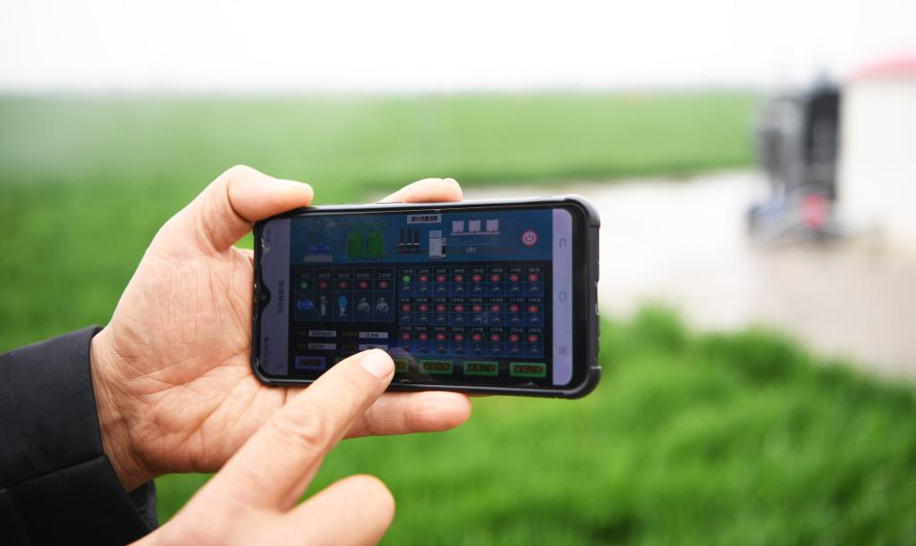 3月22日,邱守先在用手機操控水肥一體機對農田進(jìn)行灌溉。新華社記者張浩然 攝