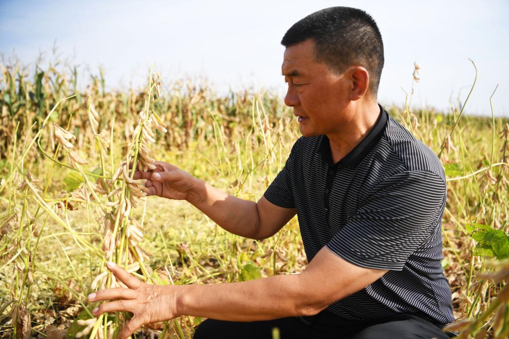 9月22日,邱守先在查看即將收獲的大豆。新華社記者張浩然 攝