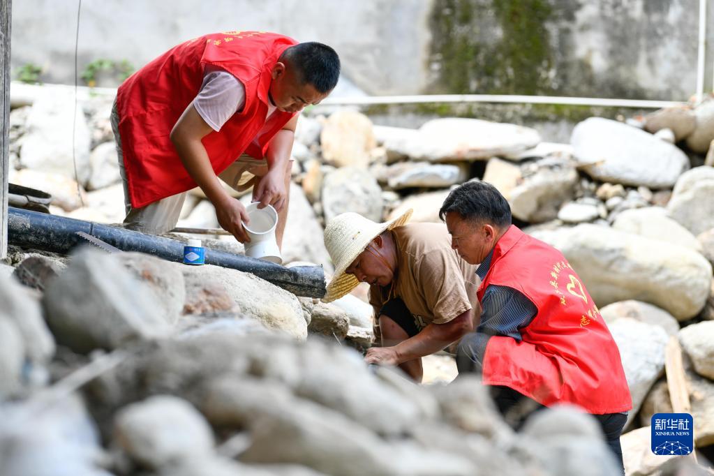 在貴州省黔東南苗族侗族自治州從江縣剛邊壯族鄉銀平村,黨員志愿者幫助遭受強降雨襲擊受災的村民修整水管(2022年7月1日攝)。新華社記者 楊文斌 攝