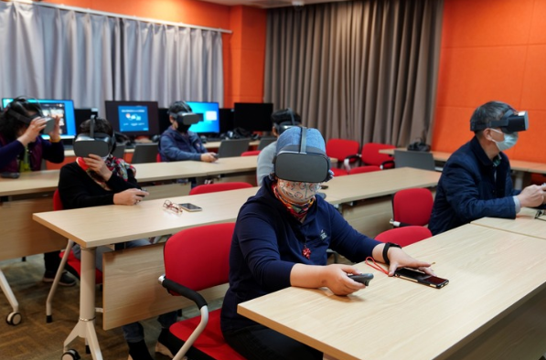 2021年11月26日,在上海老年大學(xué)欽州書(shū)院“科技島”教室,學(xué)員通過(guò)VR虛擬體驗“環(huán)球旅行”。新華社記者 劉穎 攝