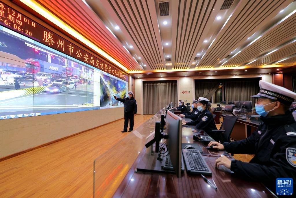 12月1日,在山東省滕州市公安局交警大隊指揮中心,借助“情、指、勤、督”一體化智慧交通管理平臺,民警對各個(gè)路口及路段交通流數據進(jìn)行綜合分析。新華社發(fā)(鐘自增 攝)
