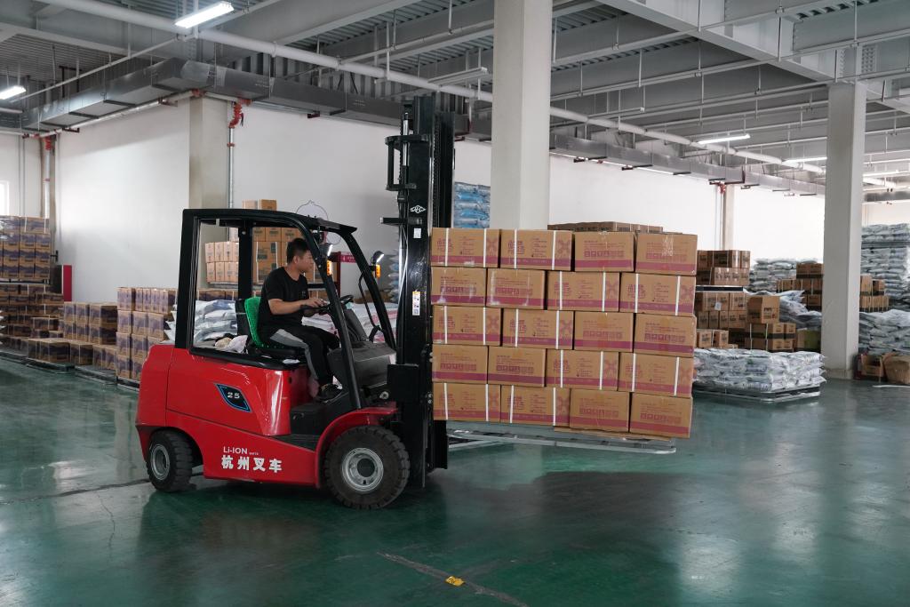 工人在華興寵物食品有限公司倉庫內拖運寵物食品。新華社記者岳文婷 攝