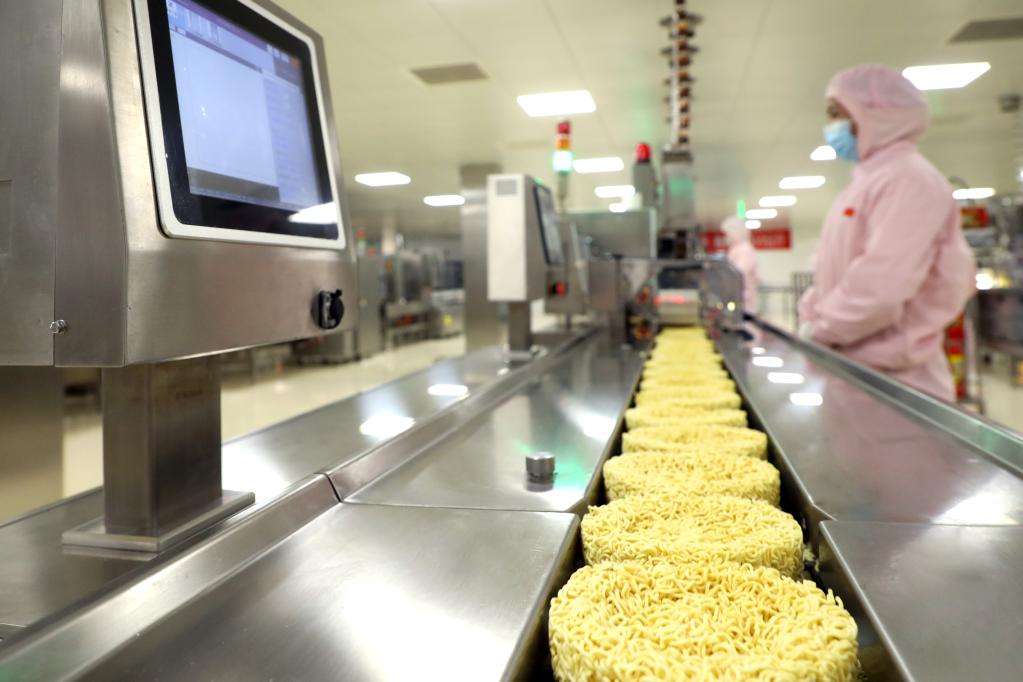 在今麥郎食品股份有限公司,員工在監測自動(dòng)化制面設備運行情況。新華社記者岳文婷 攝
