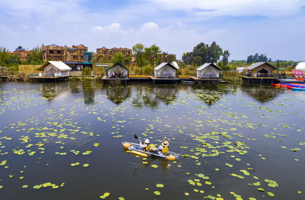 游人在滇池南岸晉寧區上蒜鎮小漁村露營(yíng)游玩(2023年4月27日攝)。新華社記者 胡超 攝