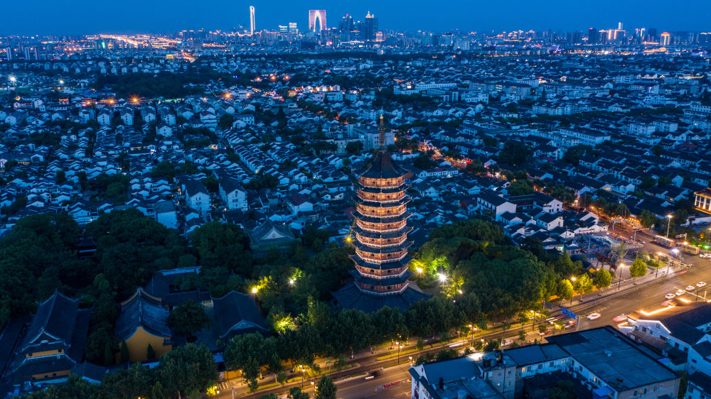 這是2020年8月24日在蘇州市姑蘇區拍攝的城區夜景(無(wú)人機照片)。新華社記者 李博 攝