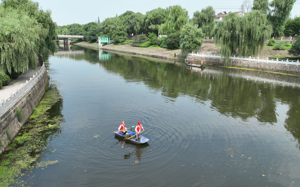 工作人員在湖州市吳興區埭溪鎮進(jìn)行河道保潔(6月21日攝,無(wú)人機照片)。新華社記者 翁忻旸 攝