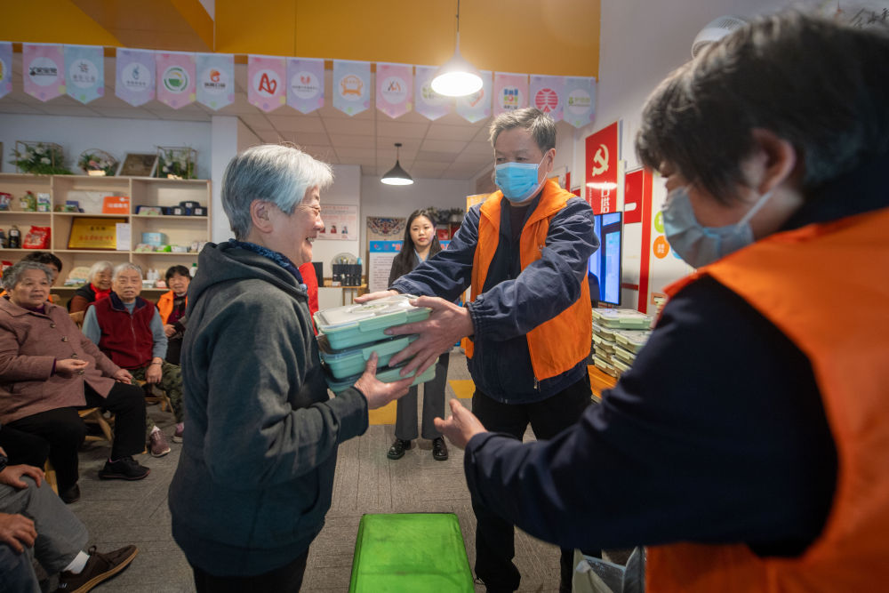 杭州市上城區南星街道白塔嶺社區志愿者在社區服務(wù)驛站為老人發(fā)放免費愛(ài)心午餐(2022年11月23日攝)。新華社記者 江漢 攝