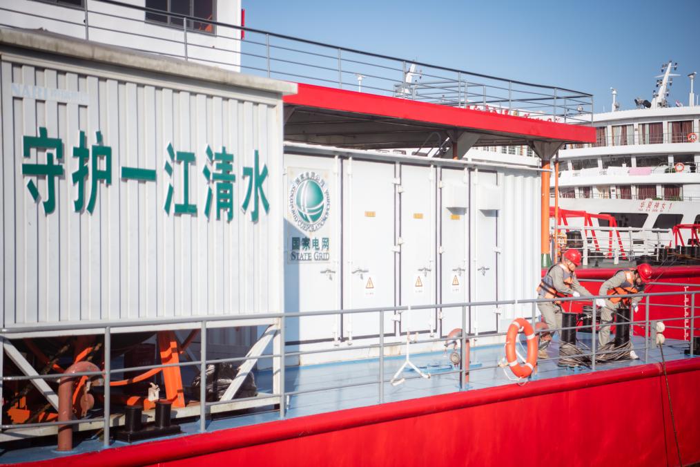 8月4日,國家電網(wǎng)宜昌供電公司岸電運維人員在秭歸港供電躉船查看岸電系統專(zhuān)用接地線(xiàn)運行狀態(tài)。新華社記者伍志尊 攝