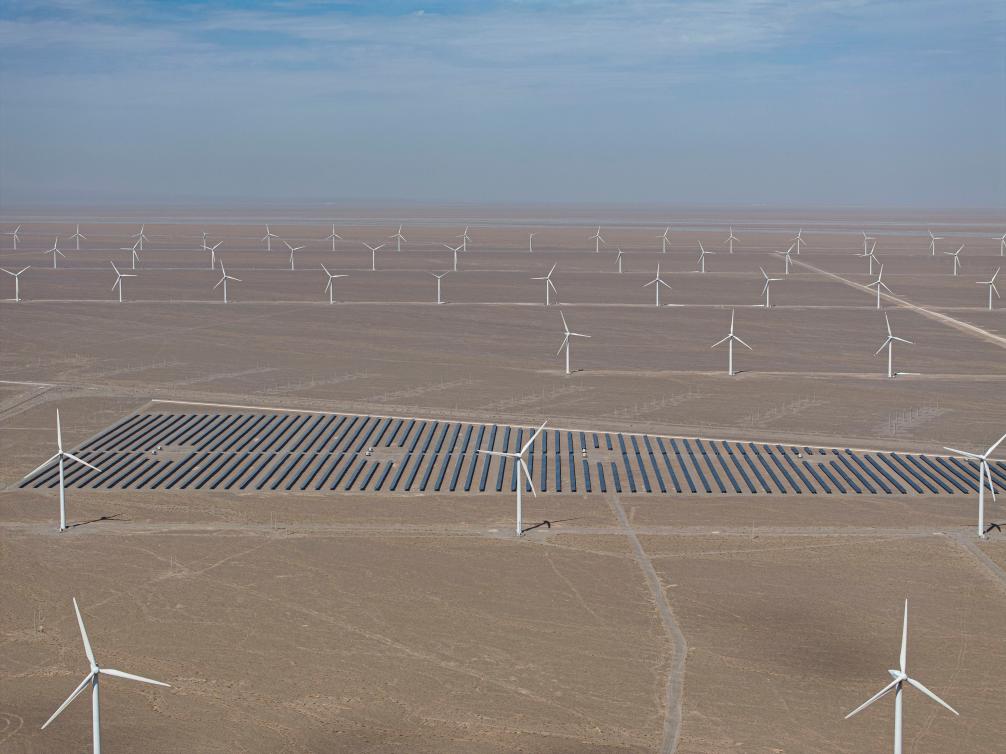 這是8月8日拍攝的甘肅省玉門(mén)市一處風(fēng)電場(chǎng)(無(wú)人機照片)。新華社記者 張可任 攝