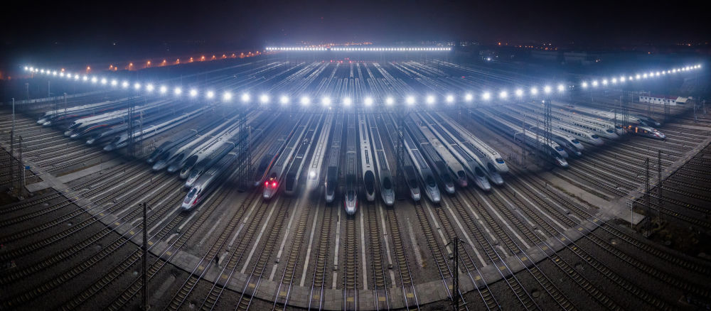 1月7日凌晨,動(dòng)車(chē)組??吭谖錆h動(dòng)車(chē)段的存車(chē)線(xiàn)上進(jìn)行檢修和保溫作業(yè)(無(wú)人機拼接照片)。新華社記者 伍志尊 攝