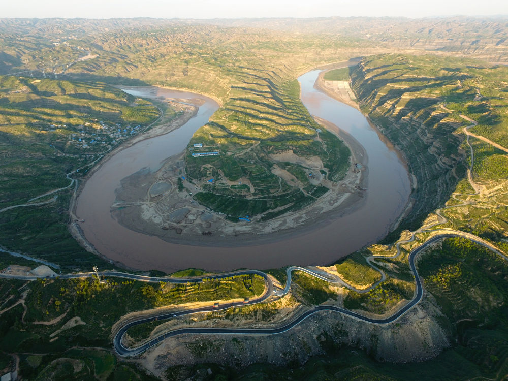 從黃河伏寺灣前穿過(guò)的陜西沿黃公路延安段(2017年8月9日攝)。新華社記者 邵瑞 攝