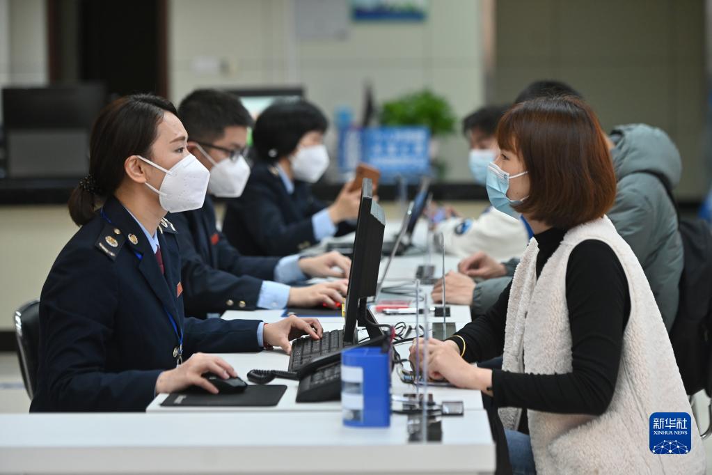 在福州市閩清縣辦稅服務(wù)大廳,工作人員向企業(yè)工作人員介紹稅惠政策(2023年2月13日攝)。新華社記者 周義 攝