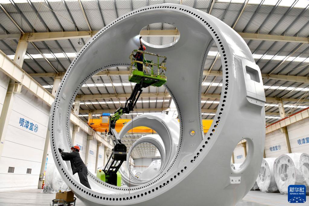 在山東省惠民縣風(fēng)電裝備產(chǎn)業(yè)基地涂裝車(chē)間,工作人員對風(fēng)電輪轂進(jìn)行涂裝(2022年6月7日攝)。新華社記者 郭緒雷 攝