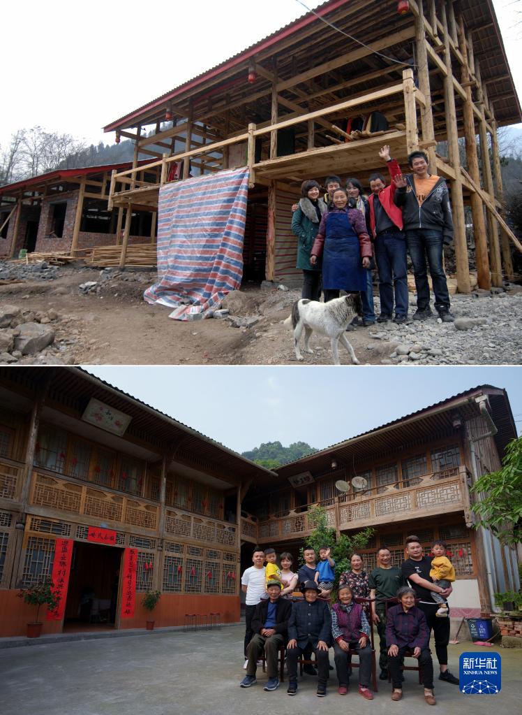 這是一張拼版照片,上圖為四川省綿陽(yáng)市安州區高川鄉茅香村群眾林興聰(右二)、李蕓香(右三)和家中的老人、孩子在重建中的住房前留影(2009年1月25日,新華社記者江毅攝);下圖為林興聰(后右三)、李蕓香(后右四)一大家13口人在房前留影(2021年5月4日,新華社記者江宏景攝)。新華社發(fā)