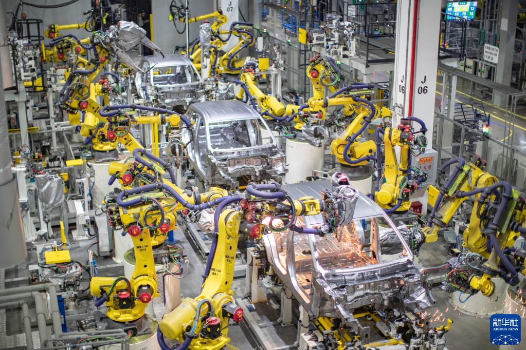 重慶一家新能源汽車(chē)企業(yè)使用智能化焊接機器人進(jìn)行焊接作業(yè)(2021年4月2日攝)。新華社記者 黃偉 攝