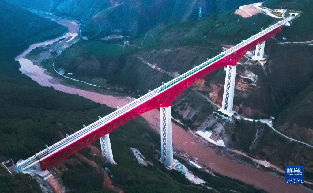 中老鐵路首發(fā)列車(chē)駛過(guò)中國云南省元江哈尼族彝族傣族自治縣境內的元江雙線(xiàn)特大橋(2021年12月3日攝,無(wú)人機照片)。新華社記者 王冠森 攝