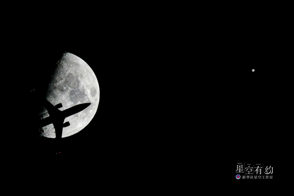 2021年1月21日在墨西哥首都墨西哥城通過(guò)二次曝光拍攝的火星(右)和月亮。(新華社記者辛悅衛 攝)